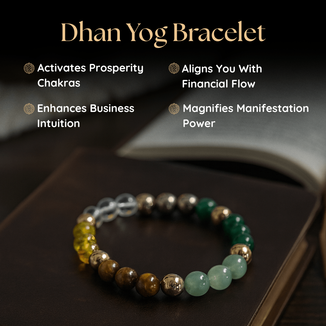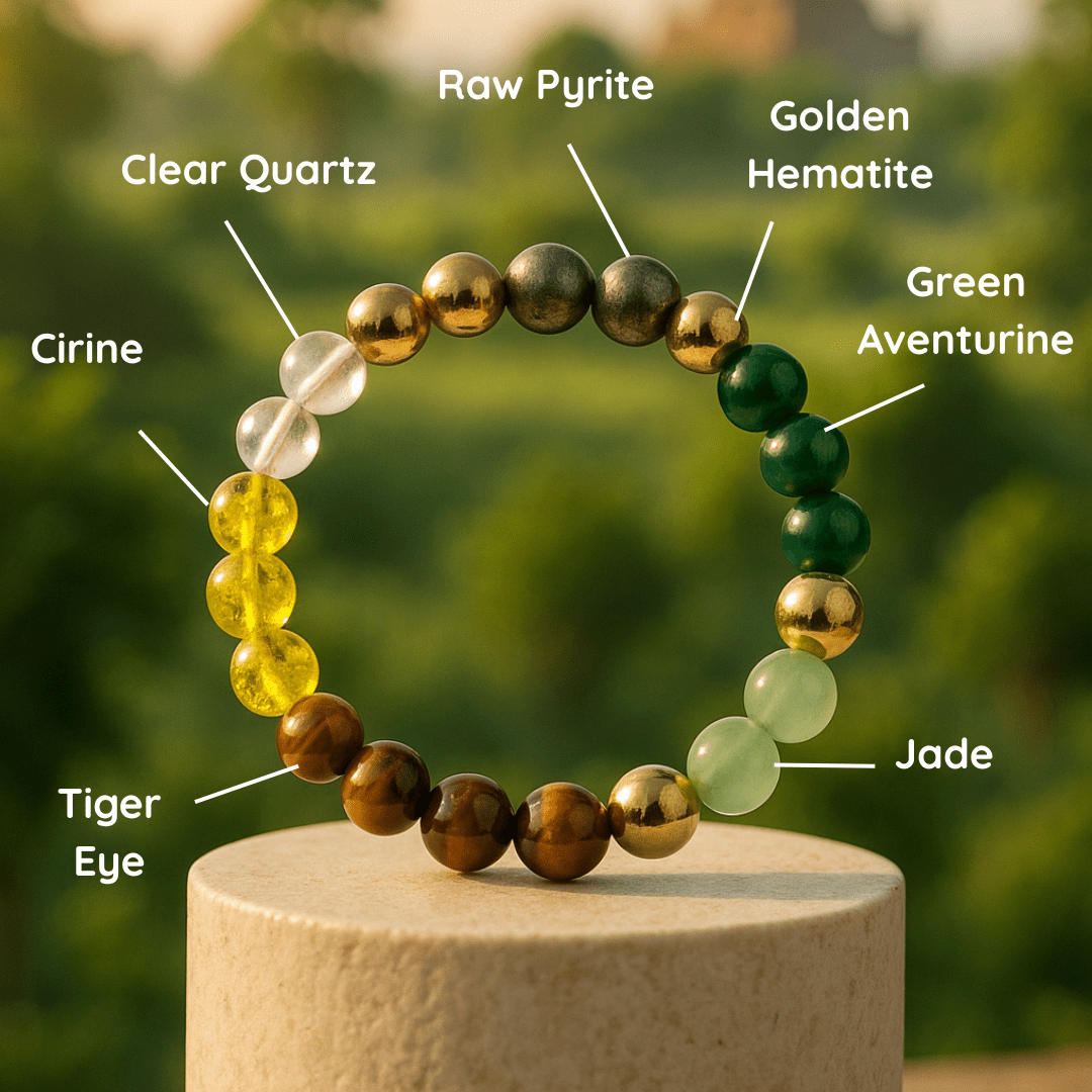 The Dhanyog Bracelet is a unique blend of seven powerful crystals — Green Jade, Tiger Eye, Citrine, Pyrite, Clear Quartz (Sphatik), Green Aventurine, and Golden Hematite — crafted to align your energy with prosperity, success, and financial growth.